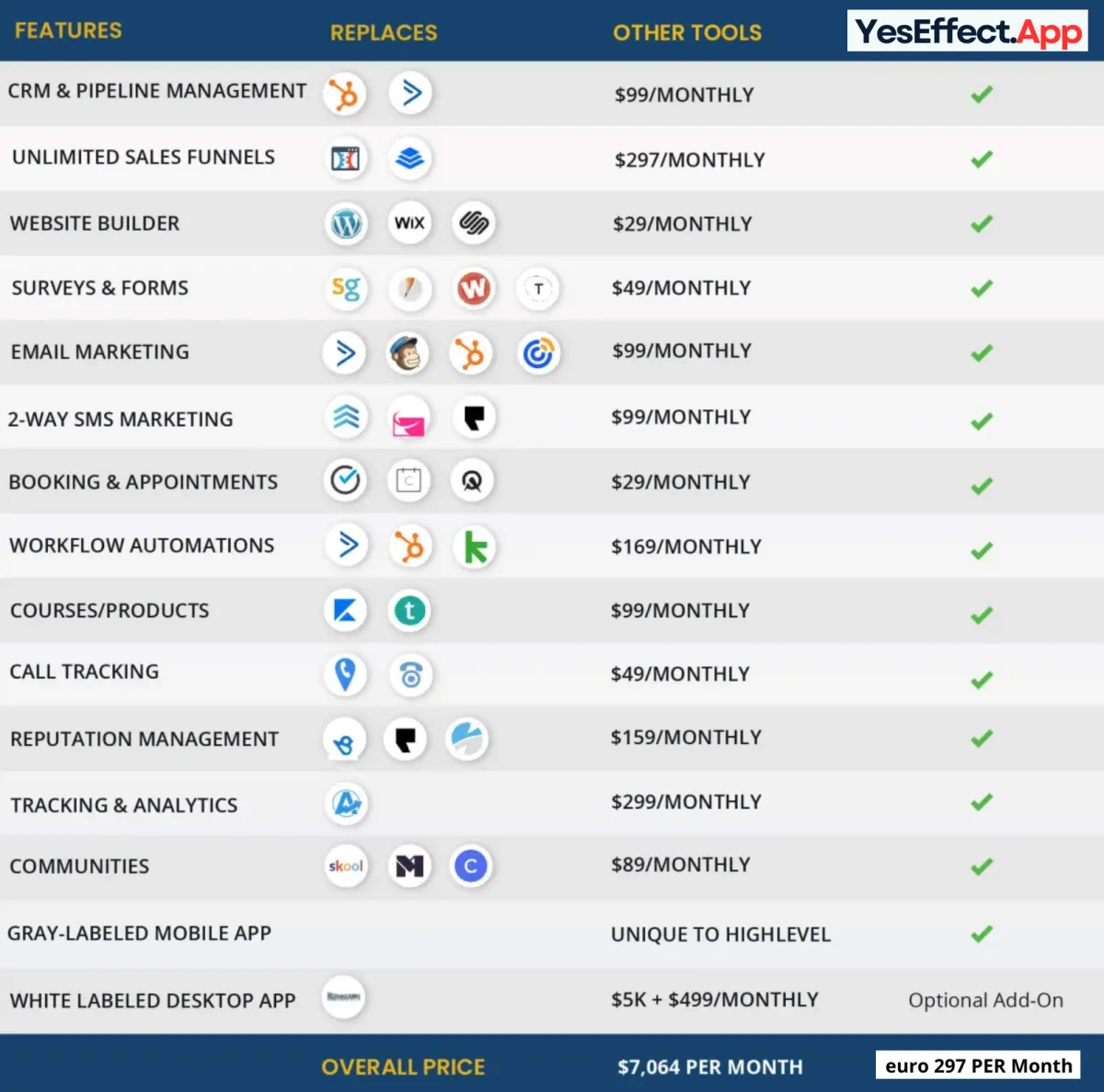 YesEffectApp replaces any kind email, crm marketing software. It has pre-built funnels and web pages, so it replaces your web page software.
